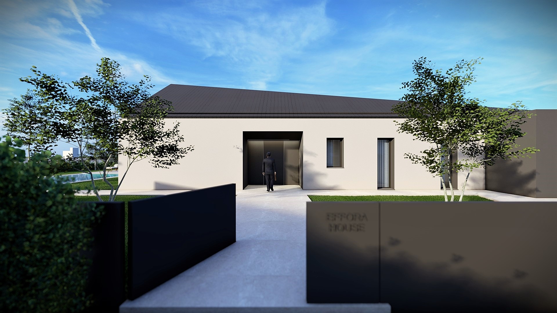 Il volume compatto, il tetto scuro e il portico profondo costruiscono una presenza semplice ma intensa.