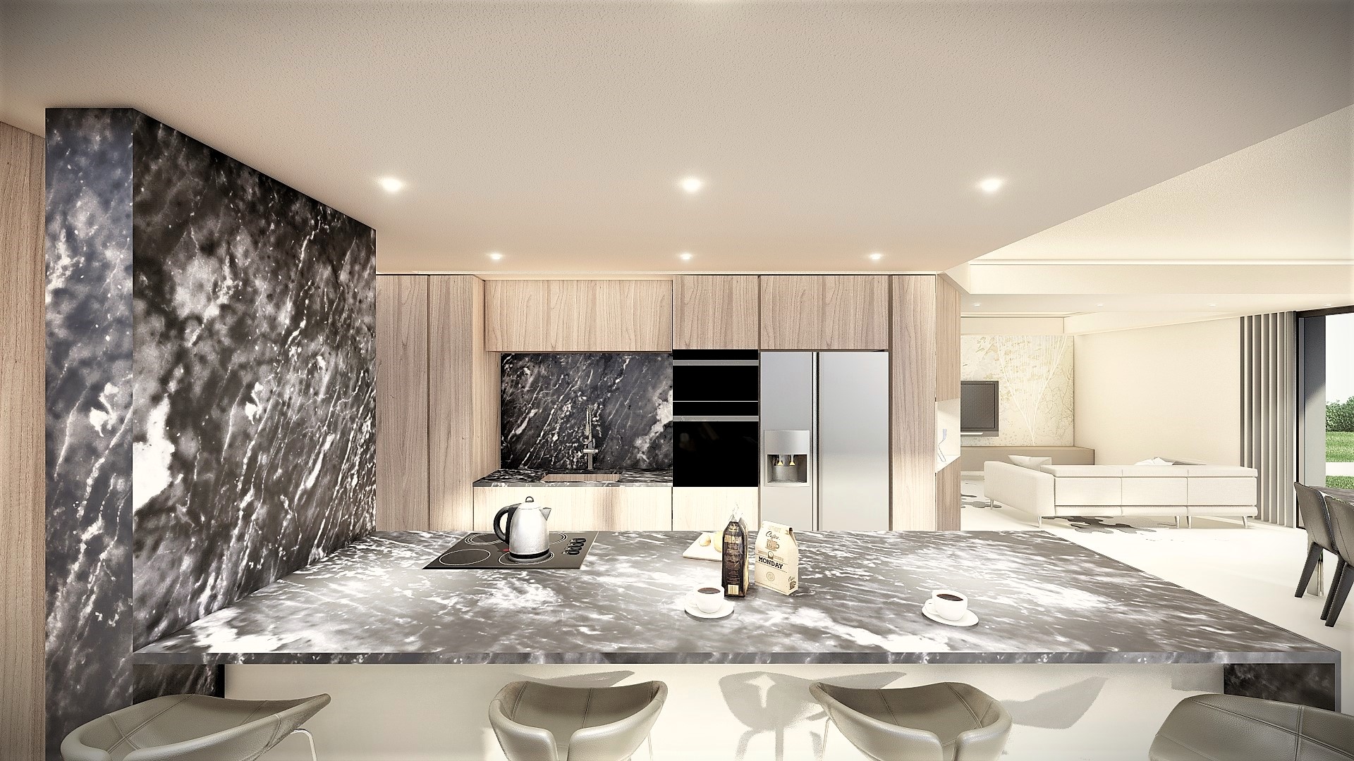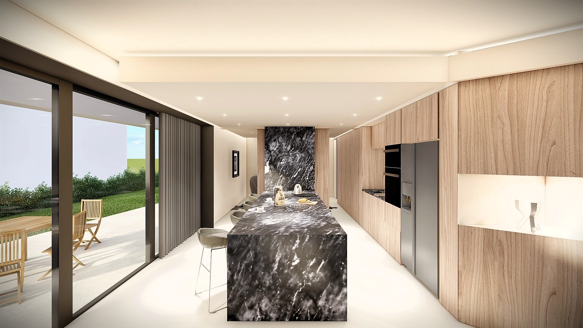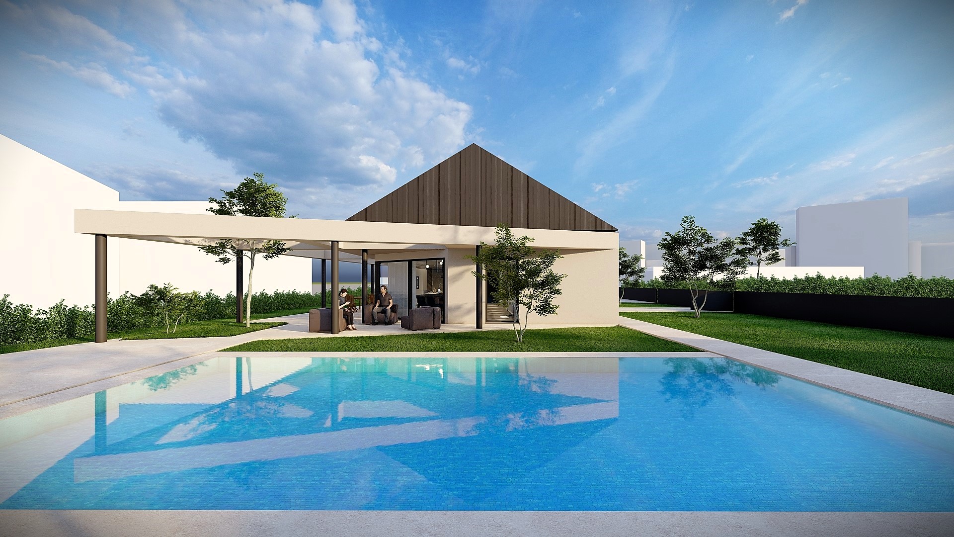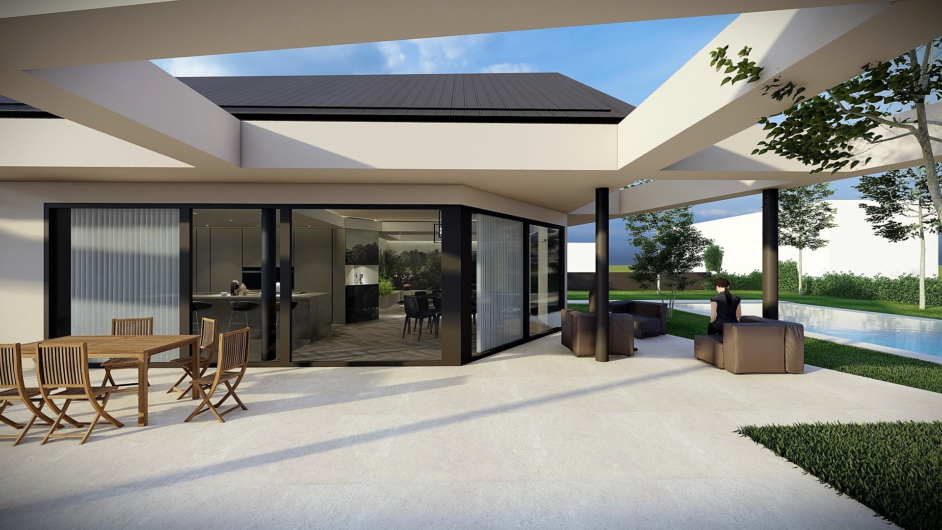 Gli interni, caldi e continui, usano materiali naturali e geometrie morbide. Il giardino e la piscina ampliano la dimensione domestica verso l’esterno.
