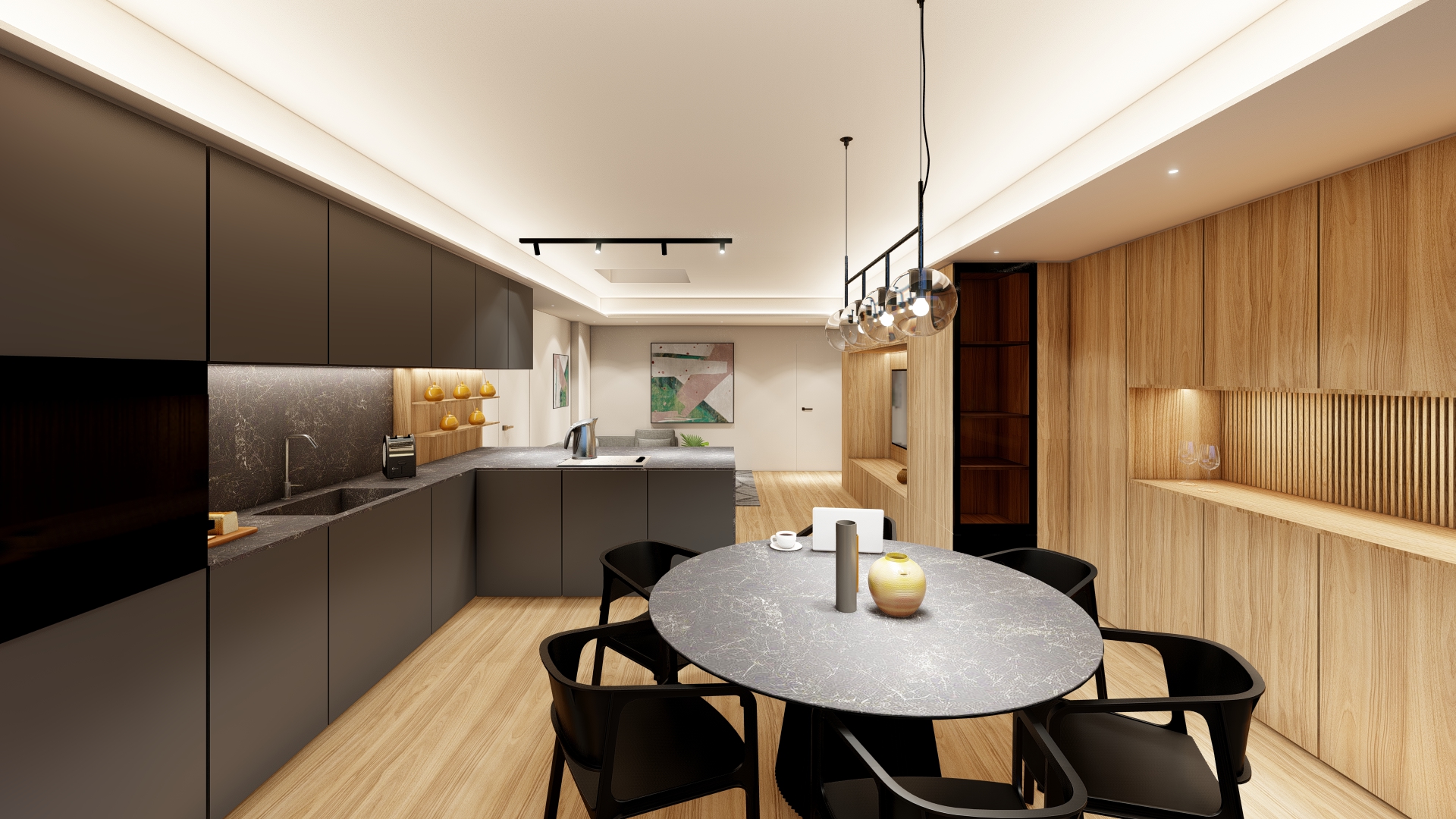 La cucina scura aggiunge densità visiva, diventando un fulcro dell’ambiente.