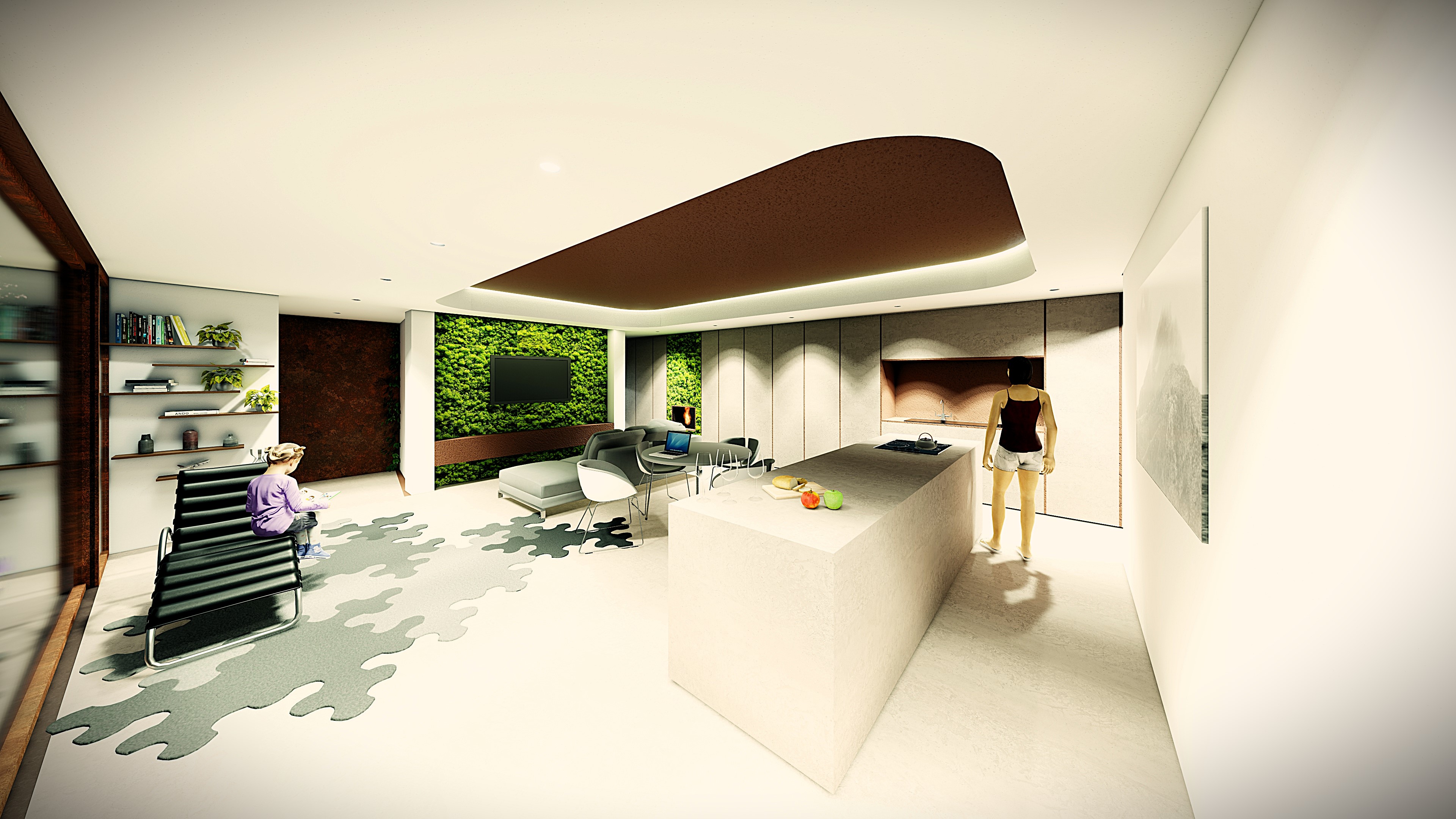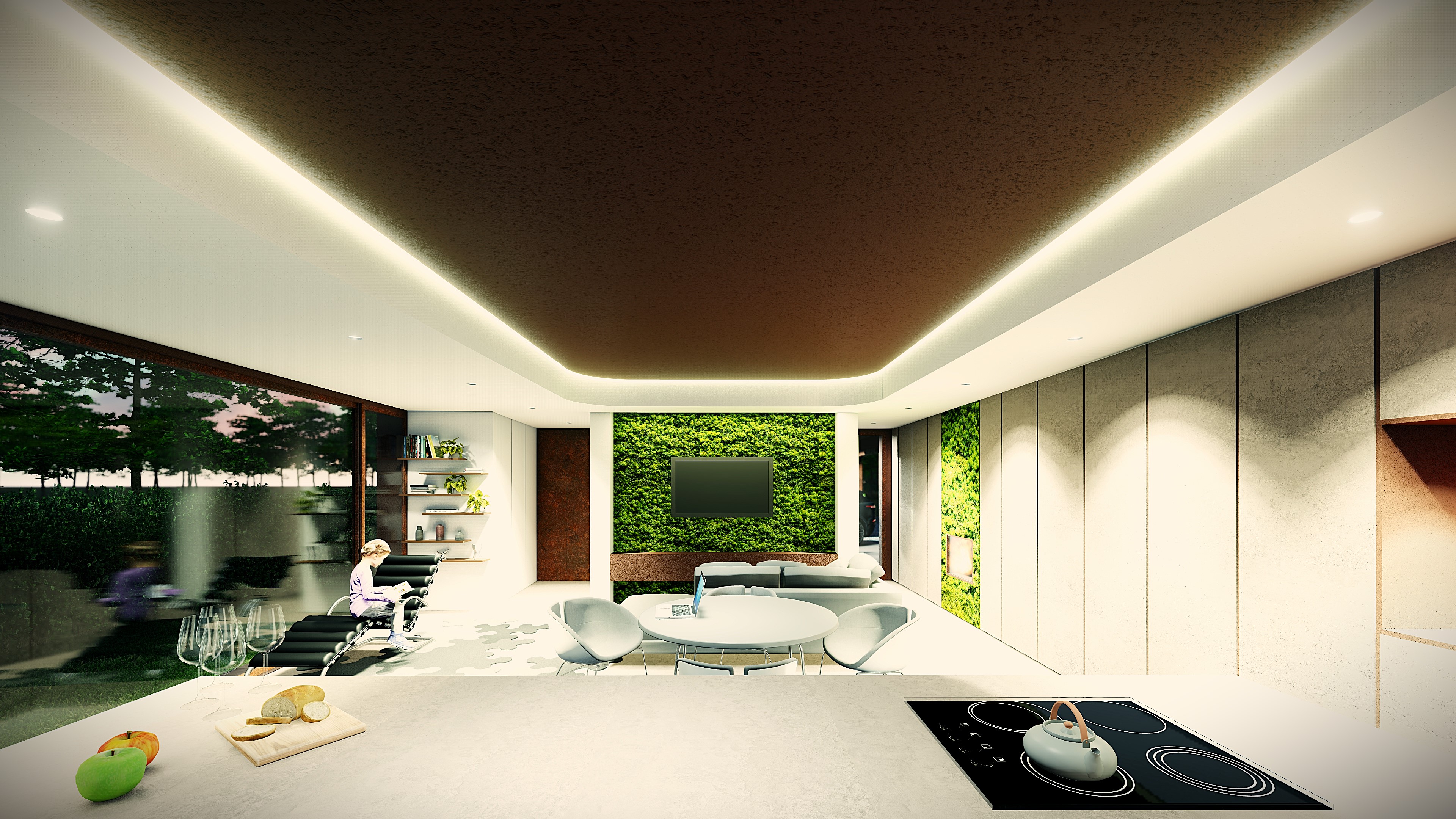 Il piano terra è uno spazio continuo che dialoga con l’esterno grazie a grandi aperture. La cucina centrale diventa luogo di relazione.