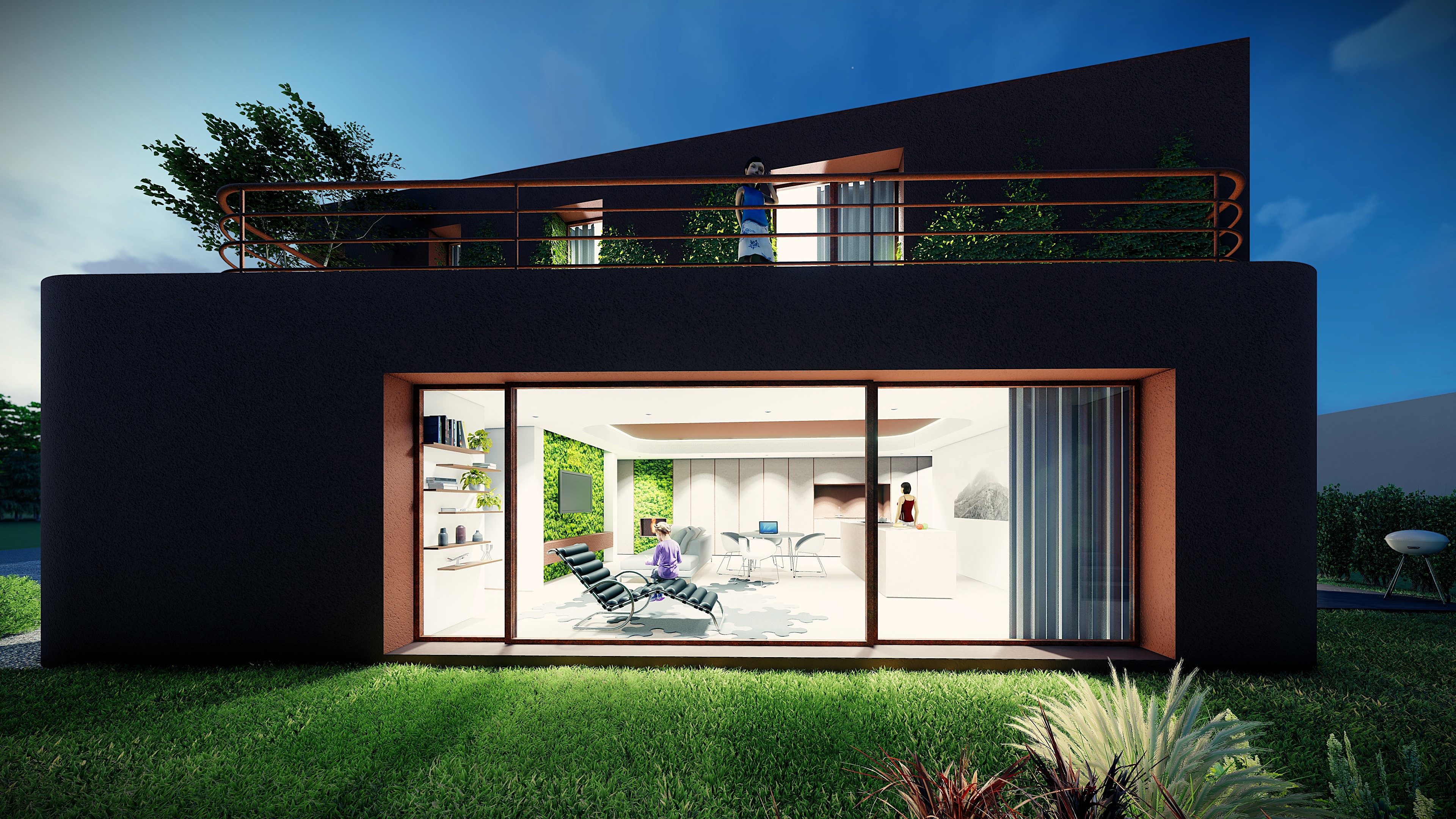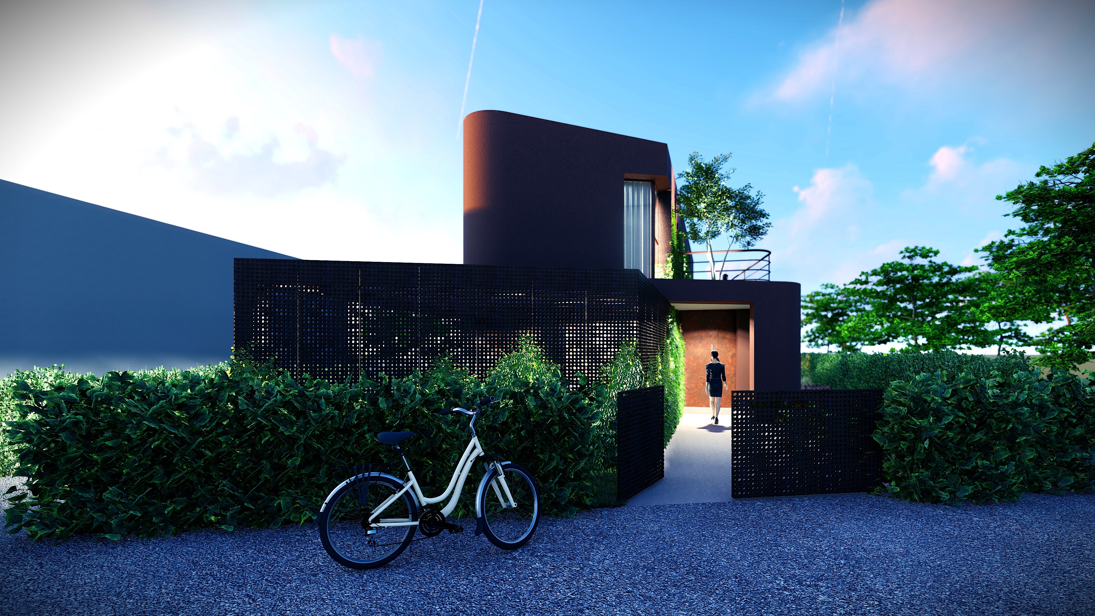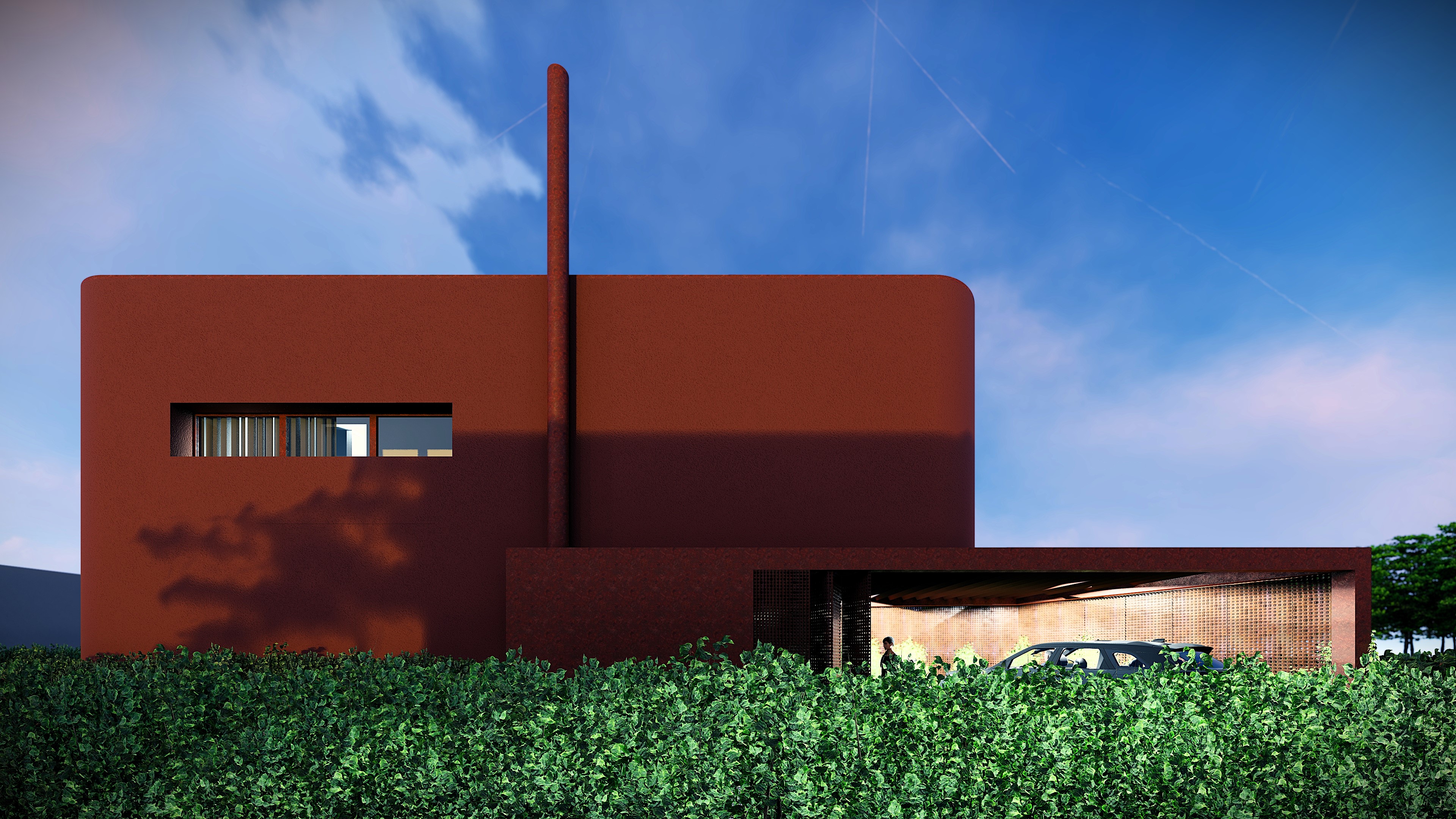 Il volume si chiude verso la strada e si apre verso il giardino, dove luce e vegetazione definiscono l’atmosfera.